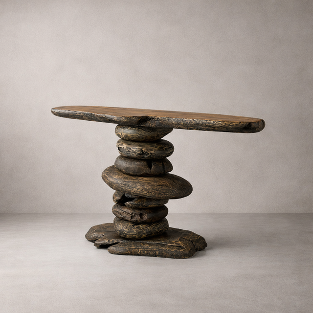 A functional sculpture for the modern home. Hand-carved from 100% recycled teak roots, each piece reveals a naturally stacked, stone-inspired silhouette that creates a striking focal point. The deep ebonized finish highlights the wood's rich grain, while expert kiln-drying ensures lasting strength and stability.Equally refined as a statement console, media stand, or sculptural accent, every piece is truly one of a kind.